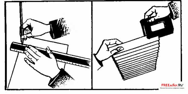 Рис.2. Расчерчивание бумажной полосы-заготовки под гофрирование и проделывание отверстий в гофре с помощью дырокола.