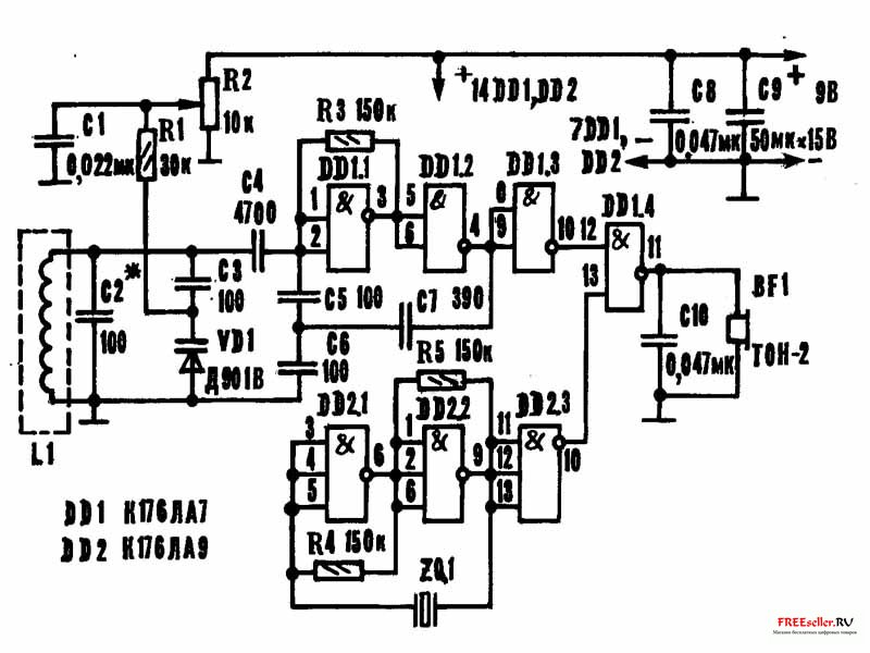 Рис.1. Принципиальная электрическая схема высокочувствительного самодельного металлоискателя.