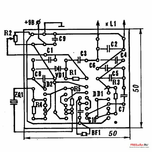 Рис.2. Печатная плата самодельного металлоискателя, с указанием расположений элементов.