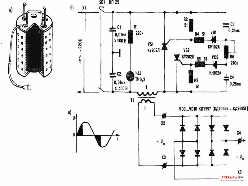 Режимы работы задают с помощью потенциометра. Совместное конденсаторами C2 и C3 он образует фазосдвигающие цепочки, каждая из которых, срабатывая во время своего полупериода, открывает соответствующий тиристор на некоторый промежуток времени. В результате на первичной обмотке сварочного Т1 оказываются регулируемые 20-215 В. Трансформируясь во вторичной обмотке, требуемые -Uсв позволяют легко зажечь дугу для сварки на переменном (клеммы Х2, Х3) или выпрямленном (Х4, Х5) токе.