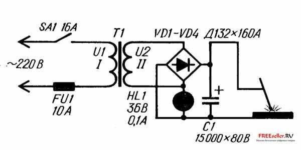 Переходя от графиков к реальным конструкциям, нельзя также не отметить: в аппаратах переменного тока для улучшения и облегчения сварки применяют мощные трансформаторы (магнитопровод - из специального электротехнического железа с крутопадающей характеристикой) и заведомо завышенное напряжение во вторичной обмотке, доходящее до 80 В, хотя для поддержки горения дуги и наплавления металла в зоне сварки достаточно 25-36 В. Приходится мириться с непомерно большими массой и габаритами аппарата, повышенным расходованием электроэнергии. Снизив же напряжение, трансформируемое во вторичную цепь, до 36 В, можно в 5-6 раз облегчить вес «сварочника», довести его размеры до размеров переносного телевизора с одновременным улучшением остальных эксплуатационных характеристик.
