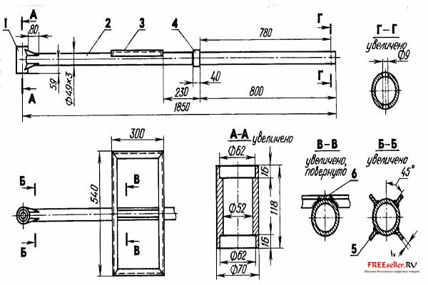 1 - корпус поворотного узла, 2 - дышло (труба 49x3, L1820), 3 - рамка подножки (уголок 25x25x4), 4 - упор (труба 58x4), 5 - ребро жесткости (s4), 6 - накладка (полоса 25x4).