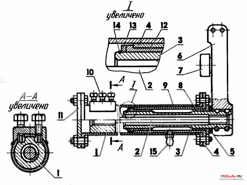 1 - муфта торсионного вала; 2 - вал торсионный; 3 - ось шатуна; 4 - втулка фланцевая; 5 - сальник; 6 - шатун; 7 - буфер; 8 - втулка фланцевая, малая; 9 - корпус; 10 - болт регулировочный (3 шт.); 11 - заглушка (СтЗ, лист s5); 12 - втулка опоры вала; 13 - шайба упорная; 14 - кольцо стопорное; 15 - масленка.