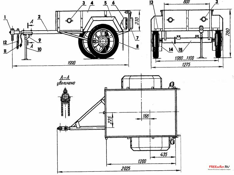 1 - шарнир шаровой; 2 - дышло; 3 - катафоты (6 шт.); 4 - борт кузова (фанера, s 16); 5 - крыло (сталь 15, s2); 6 - фонарь ФП-132; 7 - скоба (СтЗ, пруток 010); 8 - колесо (3,5x18"); 9 - кронштейн крепления передней опоры (СтЗ, лист s5); 10 - опора передняя (сталь 15, труба 20x20x2,5); 11 - разъем электрический ОНЦ-ВН; 12 - цепь страховочная; 13 - кронштейн крепления крыла (СтЗ, полоса 40x5); 14 - брызговик; 15 - узлы торсионные.