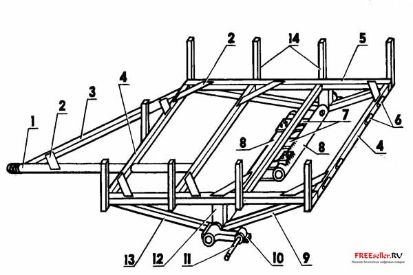 1 - дышло (сталь 15, труба 40x4); 2 - косынки (СтЗ, полоса 40x5); 3 - подкос дышла (сталь 15, труба 20x20x2,5); 4 - балки поперечные (сталь 15, труба 20x20x2,5); 5 - лонжерон (сталь 15, труба 20x20x2,5); 6 - петли навески заднего борта; 7 - перемычки торсионных узлов (СтЗ, лист s5, 6 шт.); 8 - узлы торсионные; 9,13 - подкосы опоры (сталь 15, труба 20x20x2,5); 10 - шатун подвески колеса; 11 - ось колеса; 12 - стойка опоры (сталь 15, труба 40x20x2,5); 14 - стойки бортов (сталь 15, труба 20x20x2,5).