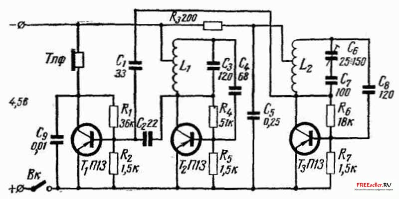 Рис.1. Принципиальная электрическая схема металлоискателя на 3 транзисторах.