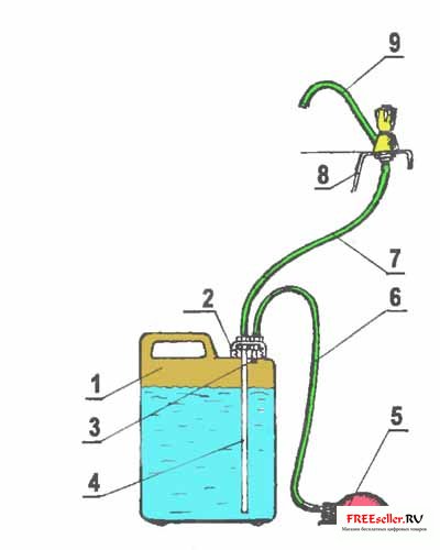 1 - канистра для воды; 2 - пробка канистры; 3 - короткий штуцер; 4 - длинный штуцер; 5 - насос; 6 - шланг для подвода воздуха; 7 - шланг для воды; 8 - мойка; 9 - кран.