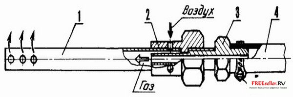 1 - запальная трубка; 2 - гайка с воздухозаборными отверстиями; 3 - штуцер; 4 - резиновый шланг; 5 - хомут