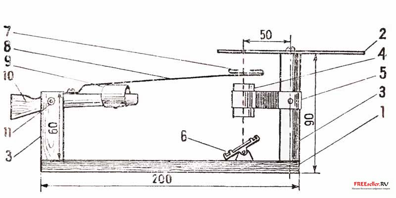 Рычаг грубой настройки соединяется с меньшей стойкой 3 шарнирно. Для этого в верхней части этой стойки прорезается паз на толщину рычага и просверливается сквозное отверстие под ось. Осью может служить винтик, гвоздь, металлический пруток. Предметный столик 8 соединен с рычагом при помощи небольшого шурупа.