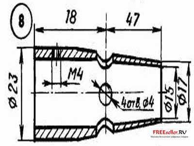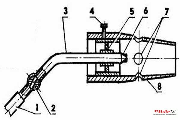 1 - шланг, 2 - газовый вентиль, 3 - трубка подачи газа (диаметром 6 мм), 4 - винт-зажим М4, 5 - вкладыш, 6 - ниппель (от примуса), 7 - четыре отверстия - воздухозаборники диаметром 4 мм, 8 - трубка насадки.![]()