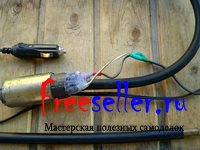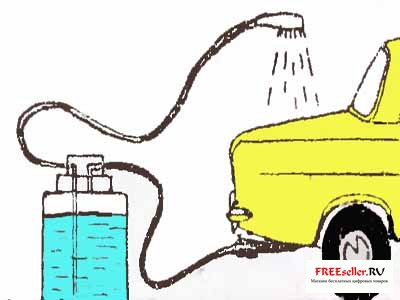 Резервуар дли воды или моющего раствора - пластиковая канистра вместимостью не менее 25 л. В середине у нее отверстие с плотно прилегающей пробкой на резьбе. В пробке сделайте два отверстия, через которые с помощью деревянного блока пропускаются и намертво заклеиваются выводы (пластмассовые трубки). На один вывод наденьте резиновый шланг, ведущий к выхлопной трубе машины, на другой - шланг со щеткой-душем. Вывод для щетки имеет еще один кусок шланга (снизу), спускаемый на дно канистры. ![]()