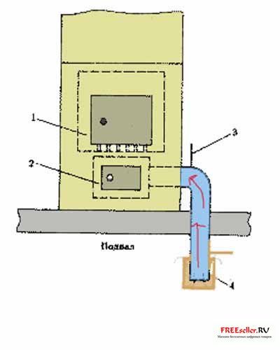 1 - топка, 2 - поддувало, 3- задвижка, 4 - искрогаситель.