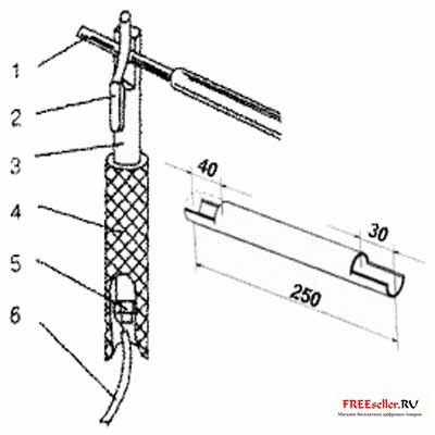 1 - электрод; 2 - пружина; 3 - труба; 4 - резиновый шланг; 5 - винт и гайка М8; 6 - кабель