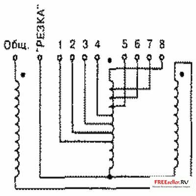 Для выводов первичной обмотки изготовьте дополнительную плату из текстолита толщиной 3 мм и прикрепите её к трансформатору, как показано на рисунке. Предварительно просверлите в ней 10-11 отверстий диаметром 6 мм и вставьте в них винты М6 с двумя гайками и шайбами. Если аппарат будет питаться от сети 220 В, то две крайние обмотки соедините параллельно, а среднюю подключите к ним последовательно (см. электрическую схему). Ещё лучше установка работает от сети 380 В. В этом случае все первичные обмотки соедините последовательно - сначала две кравшие, а затем среднюю. Выводы крайних обмоток подключите к общей клемме, а два других - к клемме «Резка». Отводы средней обмотки пойдут соответственно к клеммам «1», «2», «3» и т. д.