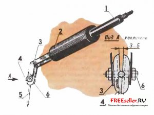 1 - кабель; 2 - ручка (стеклотекстолит, гетинакс или лигнофоль); 3 - кронштейн Г-образный (латунь, 2 шт.); 4 - ролик с четырьмя пазами полукруглого профиля (латунь, 2 шт.); 5 - электрод; 6 - ось (шпилька с раскерненными гайками).