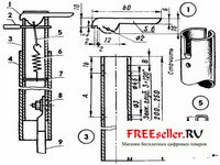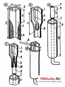 Для того чтобы изготовить такой электродержатель, достаточно подобрать из имеющихся под рукой материалов подходящие и выполнить ряд несложных операций (см. рис). Потребуется металлический уголок 1 с полками размерами 20x20 мм и длиной 100 мм. Отступив от одного из концов 10 мм, сверлим отверстие 2 диаметром 4,1 мм. Оно необходимо для того, чтобы можно было удобно и быстро менять электрод: вставив в это отверстие оголенный конец нового, вытолкнем из держателя электрод-огарок.