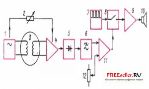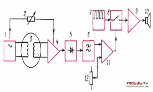 1 - генератор (3 кГц); 2 - дискриминатор; 3 - катушки металлоискателя; 4 - усилитель высокой частоты; 5 - детектор; 6 - фильтр низких частот; 7 - звуковой генератор; 8 - электронный ключ звукового сигнала; 9 - усилитель выходных сигналов; 10 - громкоговоритель; 11 - схема сравнения; 12 - регулируемое опорное напряжение.