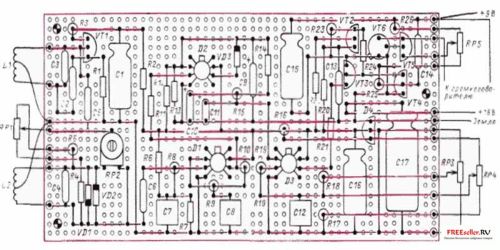 Затем на обратной стороне платы устанавливают 20 перемычек, штыри для внешних соединений, а также два штыря для конденсатора С5 (рис. 4). Затем устанавливают конденсаторы С16, С17 и микросхему D4. Эти элементы образуют источник питания с напряжением 12В. Проверка этого каскада осуществляется путем временного подключения батареи напряжением 18В. При этом напряжение на конденсаторе С 16 должно составлять 12±0,5В. После этого проводится монтаж элементов выходного каскада: резисторов R23-R26, конденсаторов С14 и С15 и транзисторов VT4-VT6. Следует учесть, что корпус транзистора VТ6 соединен с его коллектором, поэтому контакт корпуса с соседними элементами и перемычками недопустим. Так как выходной каскад при отсутствии сигнала не потребляет тока, его проверяют временным подсоединением громкоговорителя, переменного резистора RP5 и батареи напряжением 9В.