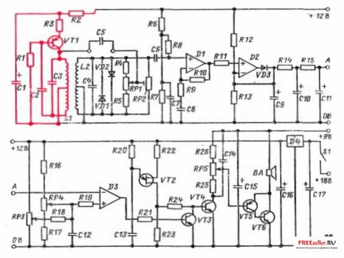 Рис.2. Электрическая схема мкталлоискателя. Передатчик показан красным цветом.