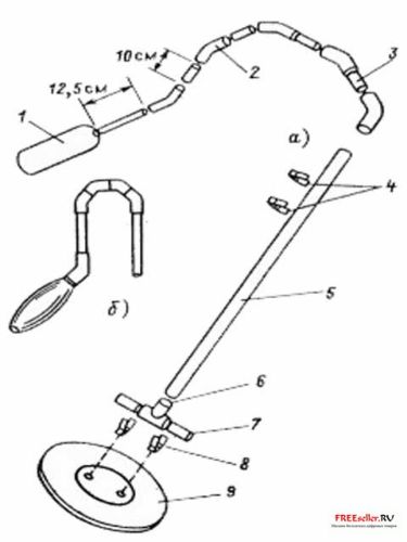 1 - ручка велосипедного руля; 2 - пять трубок, согнутых под углом 135°; 3 - три соединителя трубок длиной 5 см; 4 - фиксирующие зажимы для крепления блока управления к штанге; 5 - штанга держателя головки искателя; 6 - Т-образный соединитель; 7 - два трубчатых отрезка длиной 4,5 см; 8 - фиксирующие зажимы, крепящиеся к тарелке и обеспечивающие изменение угла наклона; 9 - пластиковая тарелка диаметром 25 см