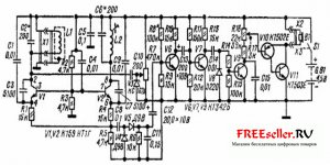 Низкочастотный сигнал с нагрузки детектора поступает через конденсатор С12 на предварительный усилитель, собранный на транзисторе V6. С нагрузки каскада (резистор R10) сигнал подается далее на усилитель - формирователь прямоугольных импульсов на транзисторе V7. Резисторами R11 и R12 задается такой режим работы транзистора, при котором он находится на пороге открывания. В итоге на нагрузке каскада (резистор R13) вместо синусоидального сигнала выделяются прямоугольные импульсы, которые затем дифференцируются конденсатором С14 и превращаются в остроконечные пики. Длительность их не зависит от частоты следования и длительности прямоугольных импульсов.