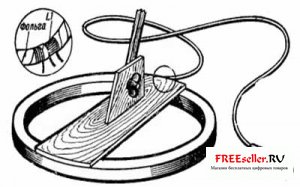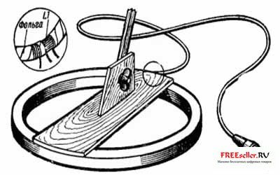 Выносная катушка L1 выполнена в виде кольца (рис. 4) диаметром 160 им. Она содержит 100 витков провода ПЭВ-1 0,3. Для намотки катушки удобно воспользоваться любым подходящим каркасом, витки укладываются внавал, а затем катушку снимают и экранируют - обматывают фольгой так, чтобы между концами экрана был зазор шириной около 10 мм. После этого катушку пропитывают эпоксидным клеем или обмазывают эпоксидной шпатлёвкой. К выводам катушки заранее припаивают проводники в поливинилхлоридной изоляции, еще один такой проводник присоединяют к фольге. После застывания клея или шпатлевки поверхность получившейся катушки зачищают наждачной бумагой и прикрепляют к катушке перемычку из фанеры или пластмассы. На перемычку устанавливают стойку, к которой прикрепляют штангу - за нее и держат катушку при поиске "мин". Крепление штанги к стойке должно быть таким, чтобы была возможность изменять угол между штангой и катушкой.
