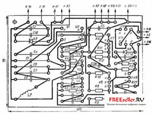 Опорный генератор выполнен на транзисторе V2 тоже по схеме емкостной трёхточки. Его частота зависит от индуктивности катушки L2 и емкости конденсаторов C6, С7, С9.