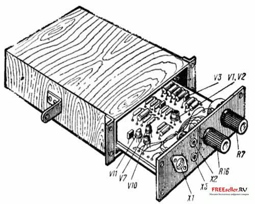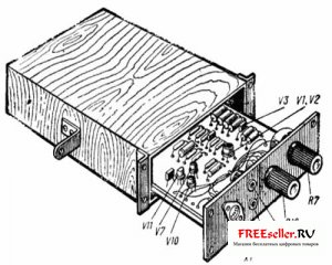 Часть деталей миноискателя смонтирована на плате (рис. 2), на которой для подпайки выводов детален установлены монтажные шпильки. Основание сердечника катушки L2 приклеивают к плате. После монтажа плату размещают в корпусе (рис. 3), изготовленном из фанеры. Размеры корпуса 115x170x40 мм. На лицевой панели корпуса устанавливают переменные резисторы, входной разъем X1 (СГ-3) и гнезда для подключения головного телефона (можно установить двухгнёздную розетку) .