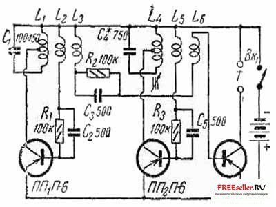 Низкочастотные составляющие этих токов прослушиваются на телефонах, включённых в коллекторную цепь триода ПП3.