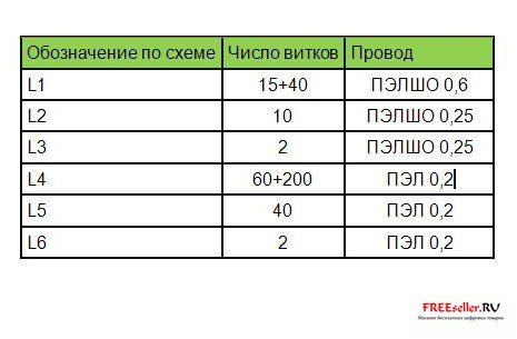 Катушки индуктивности L4, L5 и L6 наматывают на сердечнике СБ-4. Данные их обмоток приведены в таблице.