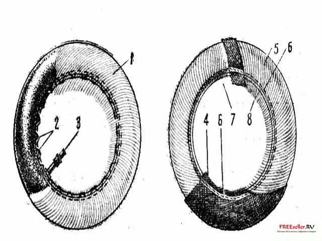 1 - участок с уложенным первым слоем, 2 - сшитые края понрышни1 3 вентиль, 4 - прослойка из сырой резины (толщина = 0,5 мм), 5 - второй слой корда, 6 - бортовое кольцо, 7 - завернутые наружу концы корда, 8 - вворачиваемые внутрь края корда.
