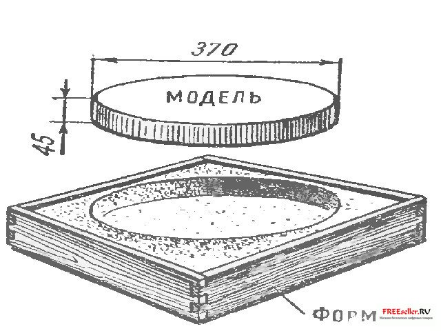 Оснастка для отливки (форма и ящик) показаны на рис. 6. Расплав алюминия можно вести прямо в форме, нагревая его пламенем газовой горелки или, как обычно, в муфельной печи. Мы, например, выполнили отливку на месте ремонта металлической ограды парка, где велись газосварочные работы.