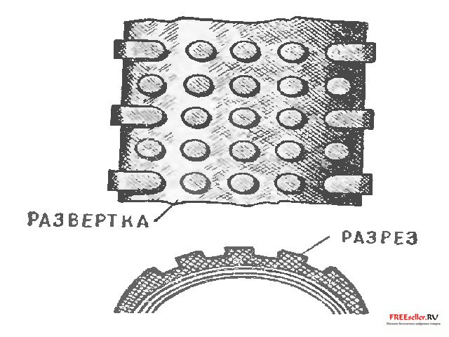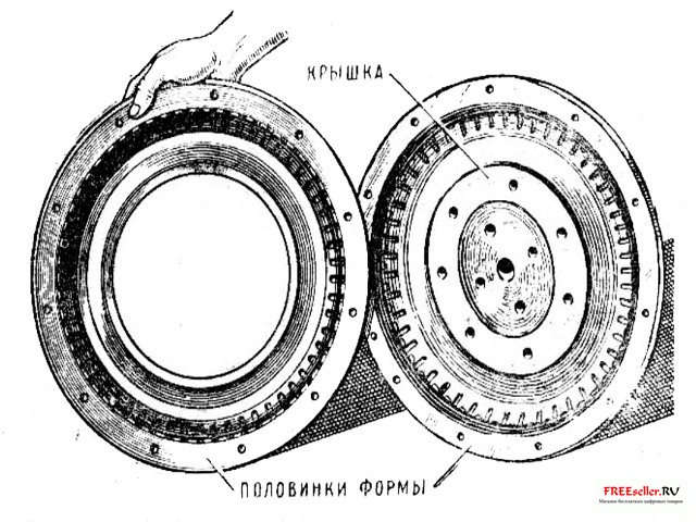 Отлитые заготовки для пресс-формы обрабатываются на токарном станке в соответствии с рисунком. Особое внимание должно быть уделено подгонке половинок формы и дисков друг к другу, а также тщательной наклепке решетки протектора (рис. 2).
