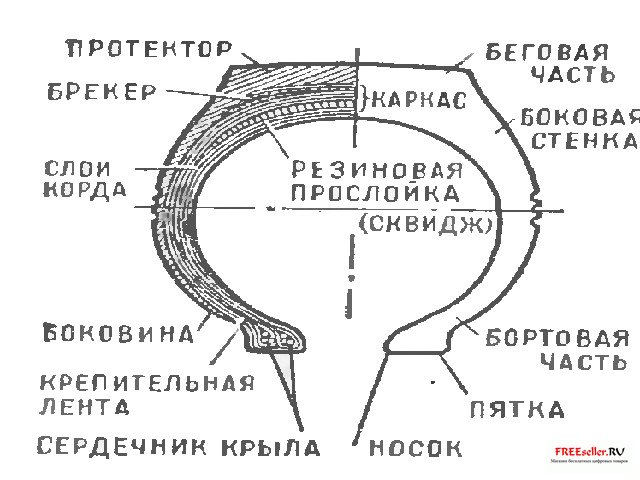 Он состоит из большого количества прочных нитей, которые расположены по всему ее периметру и образуют как бы сетку, которая способна выдерживать высокое давление заключенного в шине воздуха и большое количество толчков и ударов, воспринимаемых шиной извне. А для того, чтобы шина надежно держалась на ободе колеса, в ее борта заформовываются кольца из гибкой стальной проволоки.
