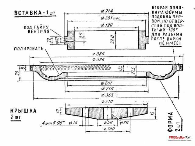 После окончательной зачистки шкуркой части матрицы приклепываются заклепками из мягкой алюминиевой проволоки к половинкам пресс формы с ее внутренней стороны. Такая конструкция пресс формы позволяет избежать сложных фрезерных работ. Сама пресс форма изготовляется путем отливки в землю, из алюминия или другого легкого сплава (нами были использованы для этого старые поршни от автомобильных двигателей, собранные на свалке).