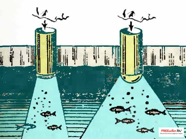 А предметы, находящиеся над водой, рыбы наблюдают тоже через своеобразном «окно», называемое, люком Снеллиуса (конус лучей в 97,6 градуса).