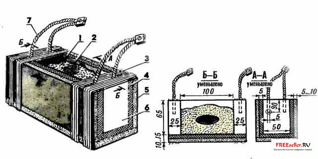 1 - порошок углеграфита; 2 - место плавки металла; 3 - провод-обвязка корпуса печи; 4 - футеровка из слюды; 5 - плитка асбестовая; 6 - электрод углеграфитовый; 7 - провод токоподводящий.