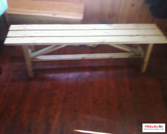 Самодельная лавка состоит из основания, состоящего из 3 досок скрепленных с нижней стороны бруском и каркасом 2-х ножек. Ножки усилены поперечинами.