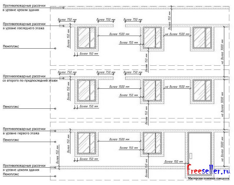 Технологический вырез в плите теплоизоляции должен перекрывать линию угла проема не менее чем на 200 мм. Не допускается размещение стыков теплоизоляционных плит на одной линии с линиями углов проемов. Технологический вырез необходимо выполнять только по линии среза, не затрагивая оставшуюся цельную часть плиты.
