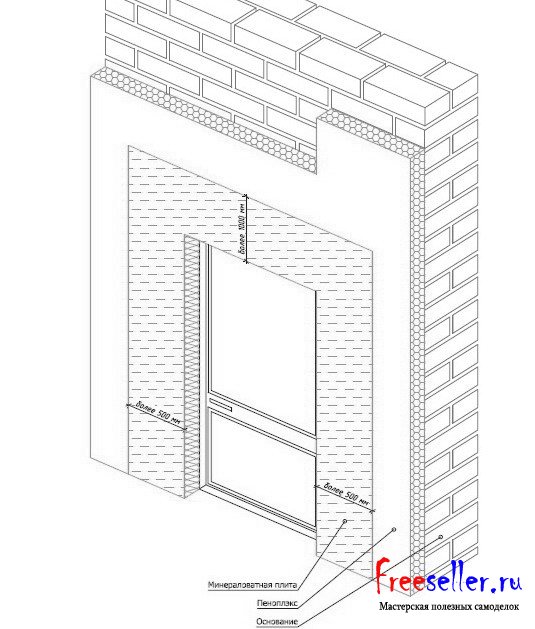 2) Если оконные и дверные проемы утоплены по отношению к плоскости фасада, на откосы так же монтируется теплоизоляционный материал. Для этого на плоскости фасада теплоизоляционные плиты устанавливаются с необходимым напуском внутрь проемов, а на откосы крепятся подготовленные по размеру плиты. Ширина и длина плит подбирается в зависимости от размера проема и неровностей откосов. Толщина утеплителя на откосах выбирается по расчетам проектной организацией. Плиты монтируются так, чтобы остающаяся, постоянно видимая ширина рамы была равной по всему периметру окна.
