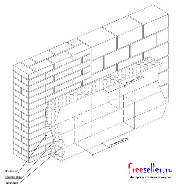 9) Приклеивание плит теплоизоляции необходимо вести рядами снизу вверх с перевязкой вертикальных стыков плит в каждом ряду (по типу кирпичной кладки). Недопустимо совмещение вертикальных стыков плит на одной линии.