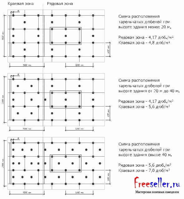 На углах здания, в зоне повышенных ветровых нагрузок, производится дополнительное дюбельное крепление. Расположение дюбелей в краевых зонах зависит от высоты здания и существующих ветровых нагрузок, размеров плиты теплоизоляции и допустимой нагрузки на дюбель. Ширина краевой зоны при высоте здания до 8 м - выбирается размером 1,0 м; при высоте здания от 8 до 12 м - 1,5 м; при высоте здания более 12 м - 2,0 м.