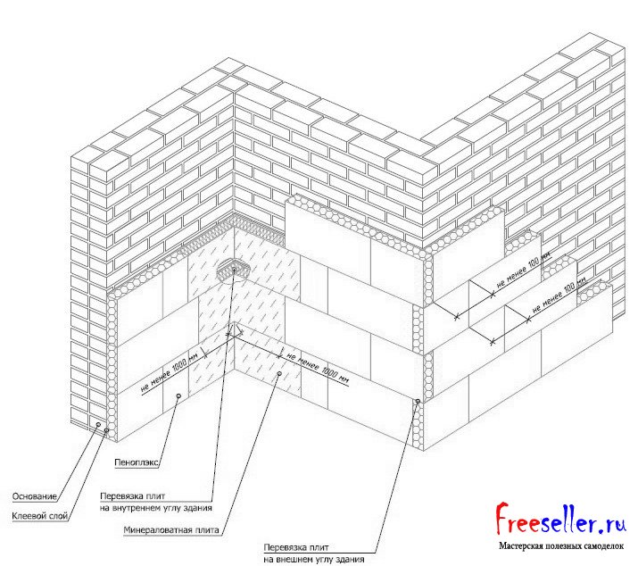 8) При наличии на здании тупых внутренних или внешних углов раскрой теплоизоляционных плит необходимо вести таким образом, чтобы максимально выполнялось зубчатое зацепление плит.