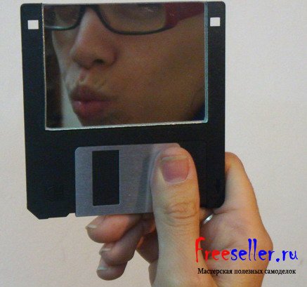 Зеркало из дискеты своими руками можно сделать вырезав в дискете с одной стороны площадки под зеркало и вклеить его туда с помощью клея.
