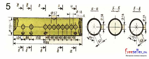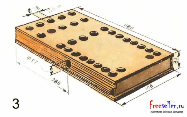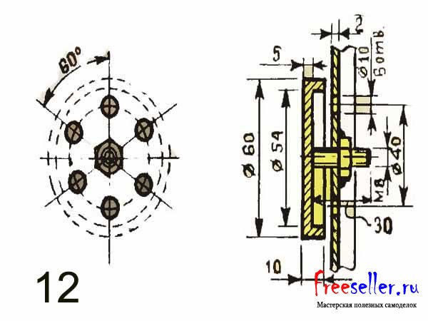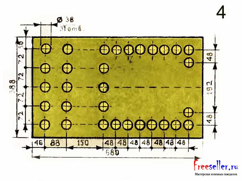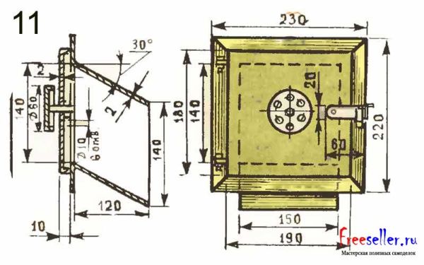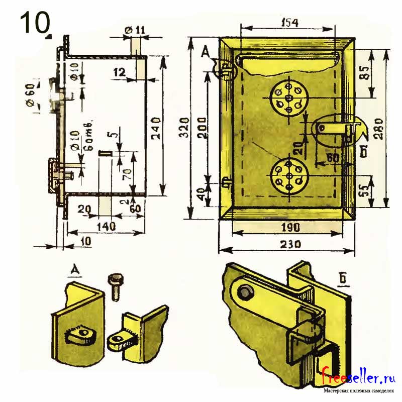 3 - общий вид прямоугольной ёмкости теплообменника (материал - стальной лист толщиной 5 мм), 4 - разметка отверстий на верхнем листе прямоугольной ёмкости, 10 - общий вид нижней топочной дверцы с двумя регуляторами подачи в топку воздуха (материал - стальной лист толщиной 2 мм), 12 - вид регулятора подачи в топку воздуха (материал - стальной диск диаметром 60 и толщиной 10 мм, стальной болт длиной 30 мм и гайка М8).