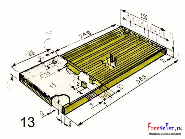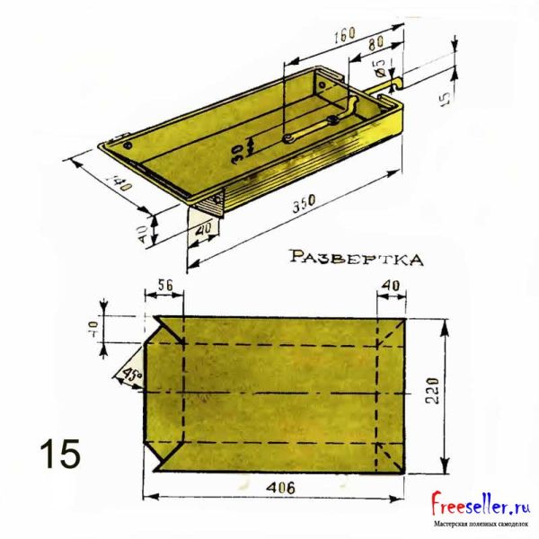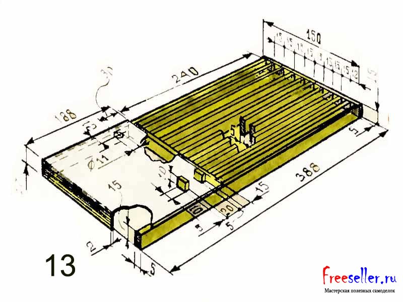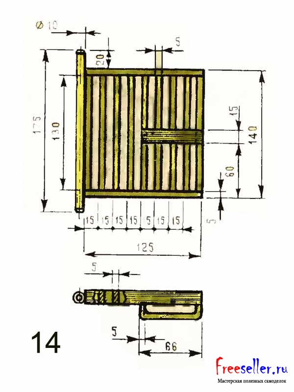 13 - общий вид колосниковой решетки (материал - стальной лист толщиной 2 и 5 мм), 14 - вертикальная передняя решётка (материал - стальной лист толщиной 5 мм, стальной стержень диаметром 10 и длиной 175 мм), 15 - общий вид совка и его развёртка (материал - стальной лист толщиной 0,5 и 5 мм).