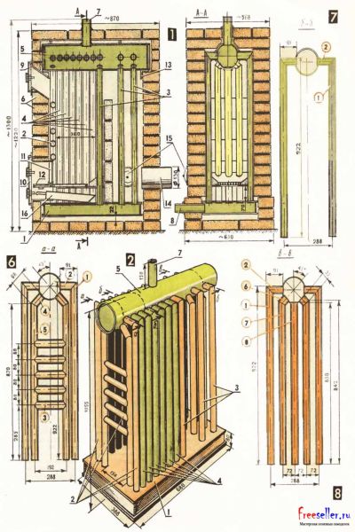 Поясним, где они располагаются. На рисунках 1 и 2 показаны теплообменник в сборе, а на рисунках 3, 4, б, 6, 7, 8 и 9 - узлы и детали, необходимые для его сборки.