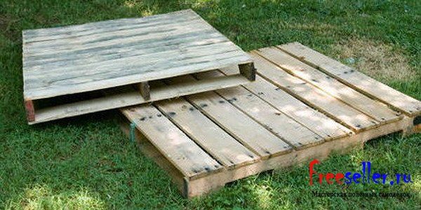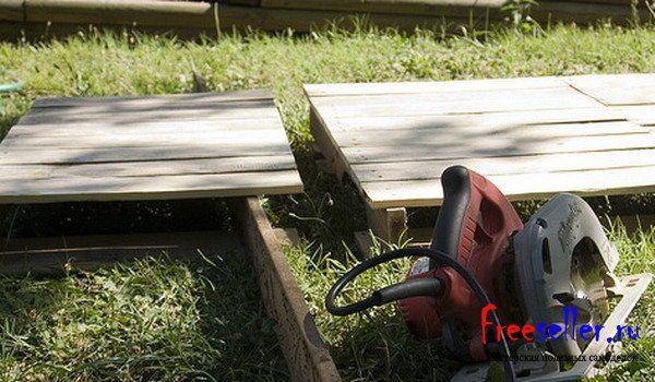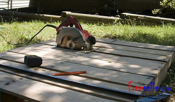 Произведите необходимую разметку, и отрежьте 1 поддон пополам с помощью циркулярной пилы, или обычной ножовки.
