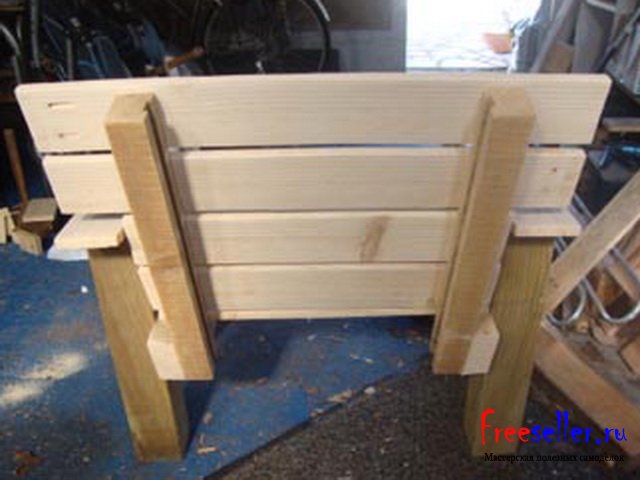 Боковые стенки образуют жесткость благодаря доскам спинки и сидушки, которые нужно прибить или закрепить с помощью саморезов.
