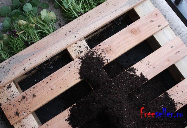 Засыпьте внутрь землю, полейте ее и посадите между планками поддо